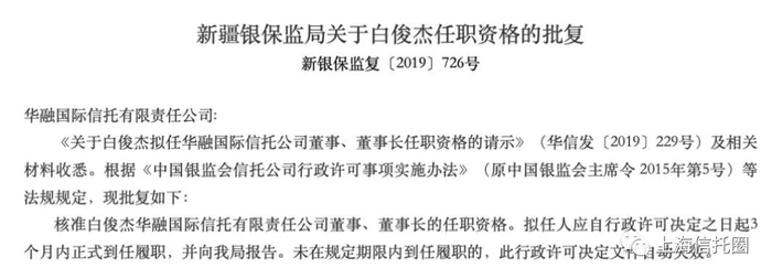 11月22日,银保监会网站披露,白俊杰华融国际信托有限责任公司(简称“华融信托”)董事、董事长的任职资格获新疆银保监局批复;