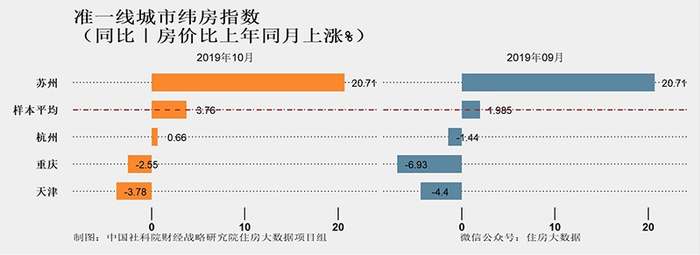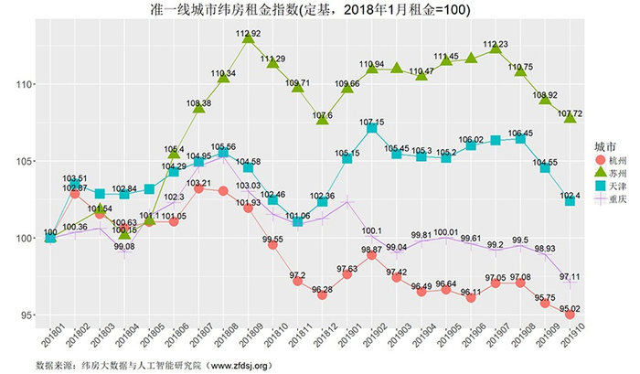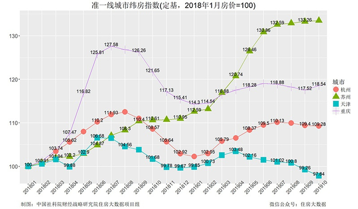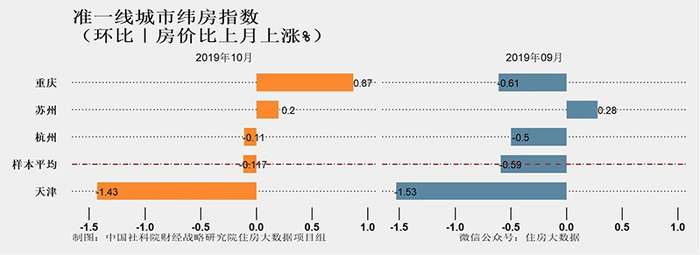 从2019年10月环比变化看,准一线城市房价平均环比下跌0.117%,跌速比上月减缓0.473个百分点。其中天津环比下降1.43%,跌速比上月收窄0.1个百分点,房价下跌速度仍较快;杭州环比下降0.11%,比上月减缓0.39个百分点;重庆环比上涨0.87%;热点城市苏州环比上涨0.2%,前期涨势得到抑制。