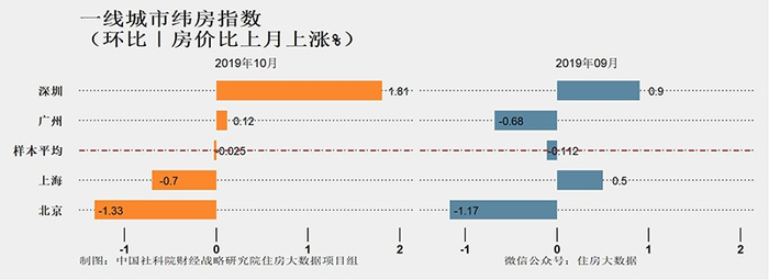 从2019年10月环比变化看,一线城市房价平均环比下跌0.025%。其中北京环比下跌1.33%,在一线城市中跌速相对较快,跌幅比上月也略有扩大;上海环比下跌0.70%;广州环比微涨0.12%;深圳房价环比上涨1.81%,涨速比上月扩大0.91%。