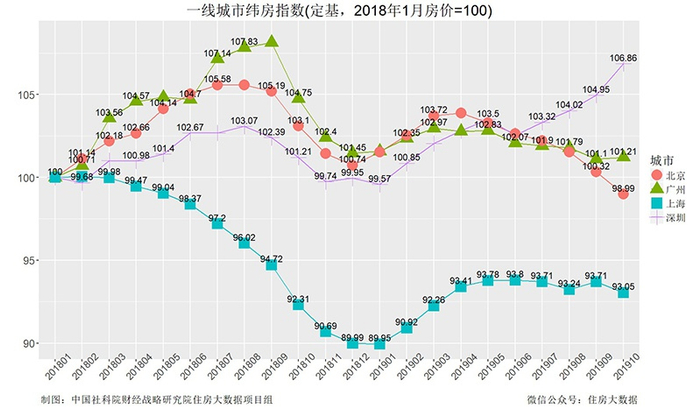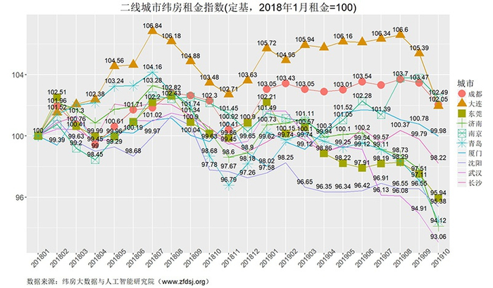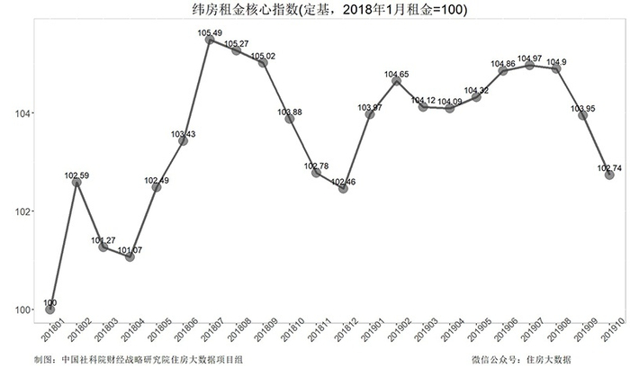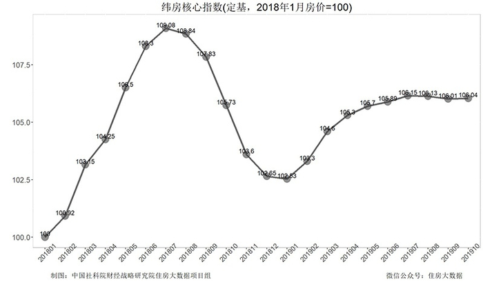 核心城市房价的季节波动率要大于年度波动率。纬房核心指数还显示,2018年10月,尽管与上年同月相比核心城市房价只上涨了0.3%,但与2019年1月的102.53点相比,核心城市房价累计上涨了3.42%。与2018年1月100点相比,核心城市房价累计上涨了5.73%。