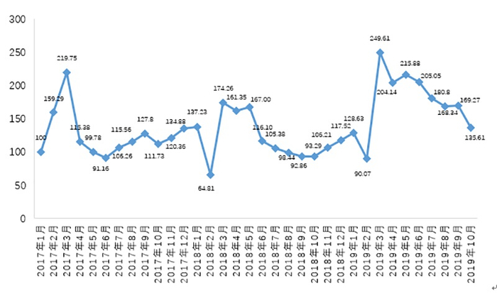 从二手房成交量指数看,在核心城市房价止涨趋稳的同时,二手住房成交量也冲高回落。2019年10月,10大重点城市二手住房成交量指数为135.61点,比9月下降了19.89%,但仍比2018年同期成交量指数高出45%。在其它条件不变的情形下,二手房成交量的持续下降,表明短期房价上涨动能减退。