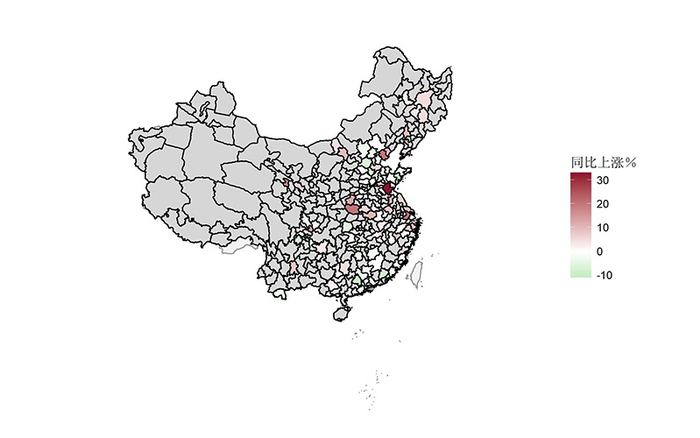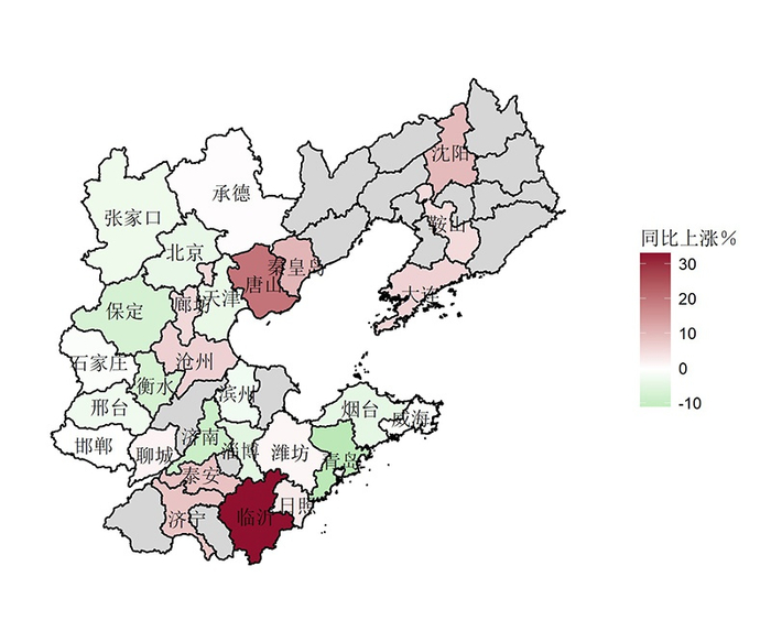 环渤海区域房价同比地图显示,京津冀一带,唐山房价同比上涨较快,大连、秦皇岛、廊坊、沧州等城市同比略涨,而北京、天津,以及河北的张家口、保定、衡水等城市房价同比下跌;山东临沂房价同比上涨较快,而青岛房价同比下跌约10%,淄博、潍坊、日照等城市房价停滞或略跌。