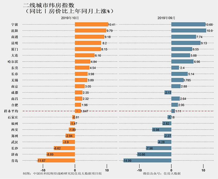 2019年10月主要城市房价同比分布图