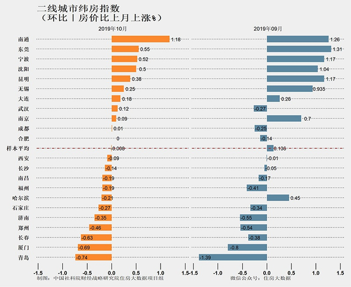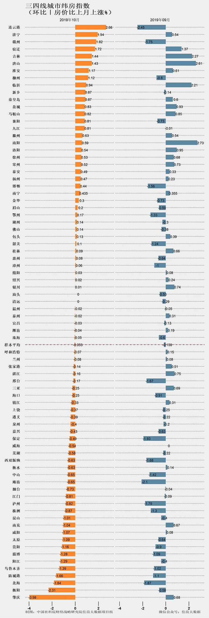 从2019年10月环比变化看,三四线城市短期房价总体微跌。三四线城市房价平均环比下跌0.055%,跌幅比上月收窄0.103个百分点。