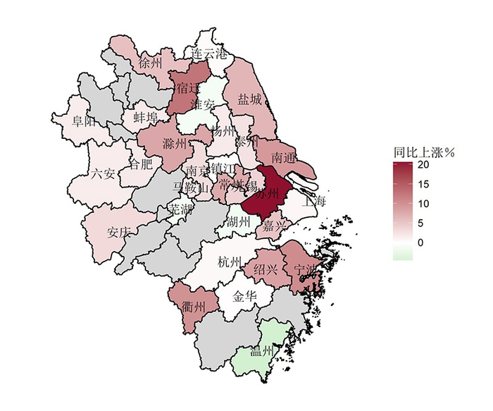 2019年10月长江三角洲城市群房价同比分布图