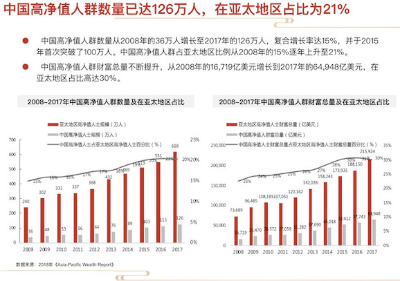中国私人财富总量迅猛增长,高净值人群数量同步激增,从2008年的36万人增长至2017年的126万人,复合增长率达15%,并于2015年首次突破了100万人。中国高净值人群占亚太地区比例从2008年的15%逐年上升至20%。与此同时,中国高净值人群财富总量不断提升,从2008年的16,719亿美元增长到2017年的64,948亿美元,在亚太地区占比高达30%。