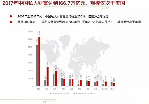 2018年是中国私人银行发展的第一个十年。中国财富市场规模迅速扩大,2007年至2017年间,中国私人财富总量增幅近200%,增速为全球之最。截至2017年底,中国私人财富总量达到24.8万亿美元(约166.7万亿元人民币),在世界各国的财富规模中仅次于美国。