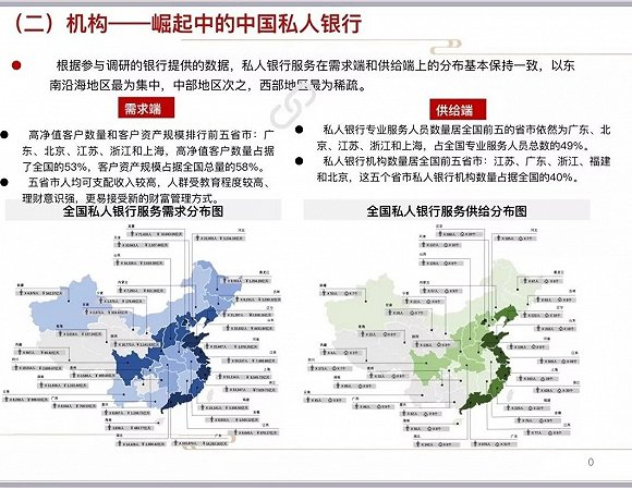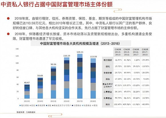 基于中国高净值人群日益凸显的财富管理需求,包括私人银行、信托、券商、基金等在内的各种金融机构迎来了前所未有的发展契机。其中,中资私人银行以其广泛的客户群体、良好的信誉口碑、与其他各大机构坚实的合作关系,先行占据了财富管理市场的主体份额。