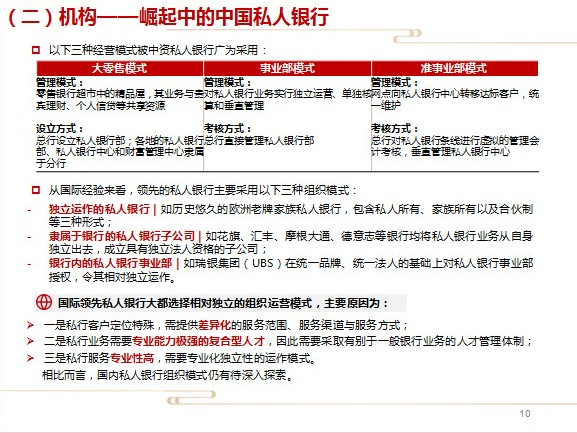 商业银行需要紧紧把握中国经济转型升级带来的历史机遇,同时依托自身资源、资金、客户基础及社会信誉等天然优势,积极开拓私人银行和财富管理市场,通过不断优化综合金融服务能力,满足客户日趋多元化的金融服务需求。