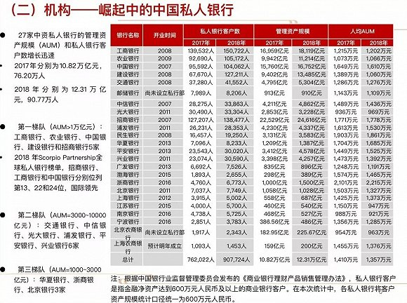 截至2018年底,工商银行、农业银行、中国银行、建设银行和招商银行五家银行的AUM均超过1万亿元(其中招行超过2万亿元),构成了中资私人银行第一梯队。根据2018年Scorpio Partnership全球私人银行榜单(以AUM计),招商银行、工商银行和中国银行分别位列第13、22和24位,招商银行更是超过了诸多百年国际大行(例如,汇丰银行、德意志银行分别位列第16和17位)。