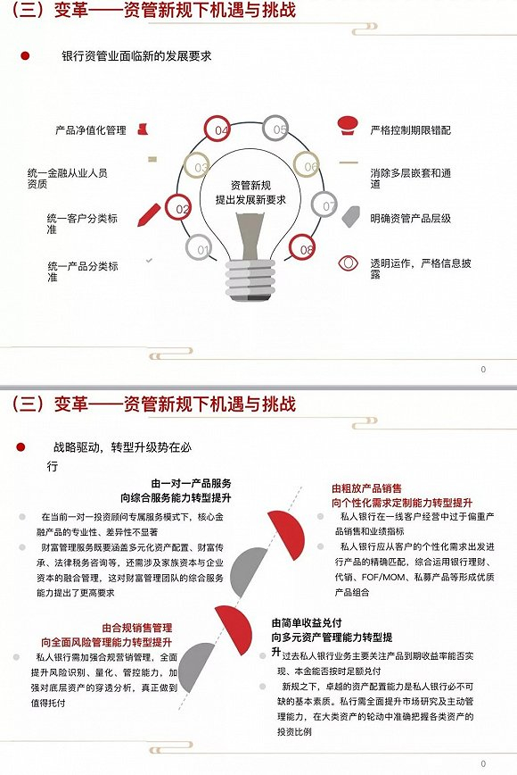 在机遇与挑战并存的新时代,资管新规对银行提出了新的发展要求,需要各家银行机构在产品分类、客户分类、从业人员资质、产品净值化管理、期限匹配等诸多方面进行重新梳理。