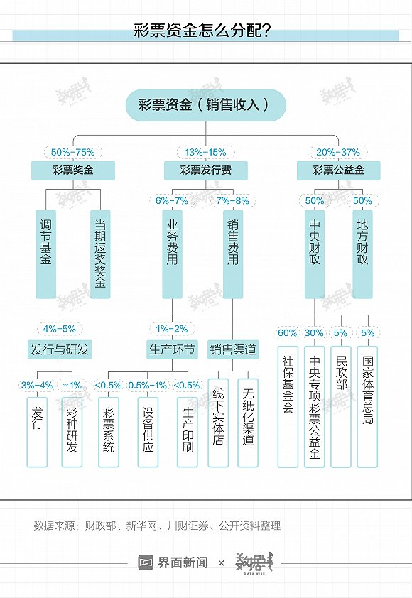 一年彩票卖四五千亿,这么多钱去哪里了?公开资料显示,彩票销售额中超过55%的比例用于支付彩民的中奖奖金,剩下约一半的收入,扣除彩票发行费后,大部分用于彩票公益金。30年来中国累计已从彩票销售收入中筹集了超过9000亿元彩票公益金。