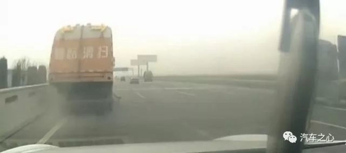 14 时 09 分,行车记录仪的画面中可以看到前方的道路清扫车正在作业的指示灯,随后开在前面的黑色轿车向右并线到第二车道。