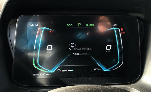 在北京出发的时候,我已经把累积行驶里程清零。跑了140公里后,车开进徐水服务区,这时电量剩下22%,表显剩余里程67公里。