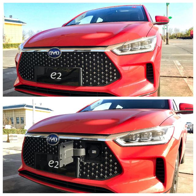e2的直流充电口在前格栅中,交流充电口在车身右后侧