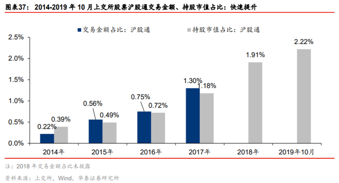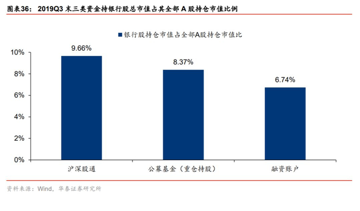 沪深股通的持股情况已体现境外资金对银行的青睐,其在市场的重要性提升有利于继续助推估值。2019年9月末,沪深股通账户持银行股市值占其全部A股持仓市值比例为9.66%,显著高于公募基金(8.37%)、融资账户(6.74%)。截至2019年10月末,沪股通账户共持有沪市股票7385亿元,占比2.22%,继续处于快速提升通道,其重要性的继续攀升利于抬升银行股估值。