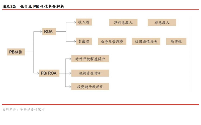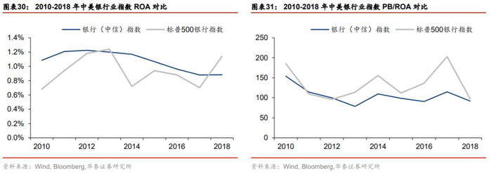 另一部分原因是投资者结构差异造成的同等ROA享受的估值低于美国。若将PB估值拆分成ROA和PB/ ROA,ROA代表银行盈利能力(基本面),PB/ROA代表市场因素对估值影响(资金面)。2010年以来中国银行业的平均ROA和美国相仿,2018年美国银行业ROA略高;抛开基本面对估值的影响,中国银行业2010-2018年PB/ ROA也低于美国银行业。这由投资者结构决定:美国市场更成熟,长期投资者、机构投资者更多,对具有稳健、低波动的银行股有更多配置需求。同等ROA时,美国投资者愿意给予银行股更高的估值。