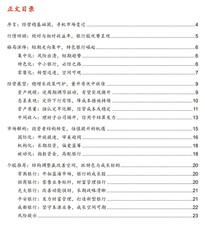 个股推荐:结构调整赢改善空间,抓特色与成长标的我们推荐资产负债结构调整动能较强的银行、特色地方银行、有成长潜力的零售及财富管理型银行,从稳健回报角度关注大型银行。第一,资产负债结构调整动能较强的银行可通过主动调整结构换取息差、资产质量等基本面表现,对抗经济下行压力,取得估值弹性。这类银行包括积极布局零售转型的银行;提升存贷款占比、回归本源的城商行等。第二,特色中小银行的服务模式稀缺,经营有望向好,且有望作为经验推广的标杆收获政策支持的利好,如常熟银行。第三,零售型银行和财富管理银行的成长空间依旧在,已经建立先发优势的银行有望持续享受估值溢价。第四,大型银行的经营确定性高,有股息率优势,是各类指数的权重股,有望收获稳健回报。个股推荐常熟银行、招商银行、光大银行、平安银行、成都银行。
