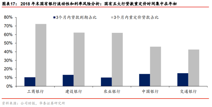 未来存量贷款或切换为以 LPR 为基准,生息资产收益率在年与年之间的波动性或加大。三季度货币执行报告的专栏中提到,未来央行将抓紧研究出台存量贷款利率基准转化方案。若存量贷款切换为以 LPR 为基准,将导致息差的波动性加大,主要有两方面原因。其一,基准调整频率提升。LPR 改革前,贷款基准利率已有近 4 年未进行调整,而 LPR 每月报价产生,变动频率或大幅提升。其二,贷款重定价时间集中于年初。以国有五大行为例,2018 年末其 3 个月内未到期但到达重定价日的贷款占比均值达到 47%,故生息资产收益率波动性加大或主要在每年一季度体现。