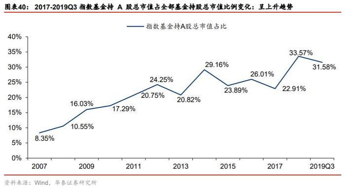 被动指数资金扩容,靠近国际主流。过去十几年,被动资金经历了快速成长。以公募基金为例,指数型基金(被动指数型基金、增强指数型基金)持股市值占全部公募基金持股市值的比例由2017年末的8.35%上升2019年9月末的31.58%。我们认为被动化趋势仍有推进空间。参考全球最大资管机构贝莱德,2019年9月末以指数形式(ETF、非ETF指数)投资的权益资产占全部权益资产的比例高达91.67%。