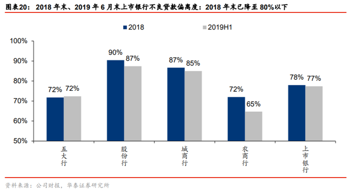 资产质量管控严格化程度持续提升,存量风险压力释放。2018年银监会7号文通过差异化的拨备覆盖率/拨贷比监管政策鼓励银行将逾期90天以上贷款纳入不良贷款。2019年银保监会发布《商业银行金融资产风险分类暂行办法(征求意见稿)》,明确规定逾期90天+资产需纳入不良资产。在监管引导下,存量风险贷款严格确认,2019年6月末全部上市银行不良贷款偏离度均已低于100%,上市银行整体不良贷款偏离度下降至77%。部分银行已设置了更严格的不良贷款认定标准,将逾期60天以上贷款全部计入不良类,如邮储银行2018年末逾期60天以上贷款即已基本全部纳入不良贷款。