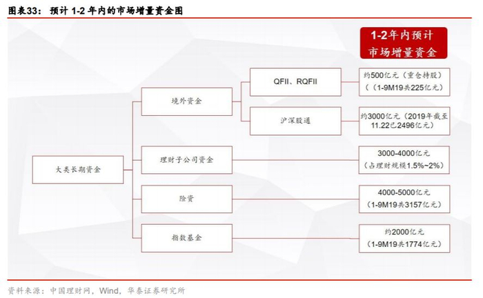 A股正发生三方面的变化,逐渐对标成熟市场,为银行股创造估值提升空间。1)对外开放带动A股投资风格国际化,与海外趋同。2)保险、养老金、银行理财等资金加速进入资本市场,机构投资者的地位不断提升,逐渐占据主导定位并掌握定价权。3)被动管理的指数型资金继续加速崛起。我们预计1-2年内,境外资金、机构资金、被动资金的入市规模有望达到1.2万亿元~1.5万亿元。三类资金的股票配置中,银行股的占比均更高,其作为增量资金入场,有利于银行股的估值提升。