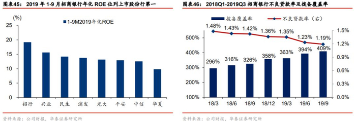 招商银行的投资逻辑为作为建立了零售与财富管理先发优势的银行,抵御周期能力强、继续成长可期。招商银行深耕零售业务,2019年上半年零售收入贡献与税前利润贡献分别为 54.5%、 59.7%。招商银行建立了财富管理先发优势,2019年1-9月财富管理收入占比超过10%。零售和财富管理优势助其建立了盈利能力和资产质量优势:盈利能力方面,2019 年前三季度招行ROE在上市股份行中排名第一,且已经企稳回升。资产质量方面,2019Q3末不良贷款率仅有1.19%,远低于其他上市股份行;拨备覆盖率超过400%,风险抵御能力强大,为利润提供了安全垫。零售与财富管理业务的客户需求、资产质量的周期性较弱,且成长空间依旧较大,招行作为领先龙头银行是首要获益者。