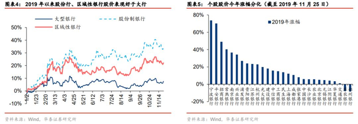 银行板块内部走势分化明显。受政策环境宽松、同业利率下行等因素影响,银行板块涨幅总体呈现股份行>区域性银行>大型银行的格局。从上年末到 2019 年 11 月 25 日,股份行指数上涨 34.24%,区域性银行指数上涨 22.09%,大行指数上涨 7.59%。2019 年金融供给侧改革强调提高中小银行的数量及业务比重,中小银行的战略地位提升;同业负债成本持续下行,对同业负债占比较高的中小行基本面也形成了呵护,因此中小行走势相对较好;年中包商银行被接管事件导致的流动性分层使得股份行的走势与区域型银行拉开。个股层面,年初至今涨幅较高的标的包括宁波银行(73.71%)、平安银行(70.22%)、招商银行(49.06%)、常熟银行(40.36%)、南京银行(36.58%),反映市场对转型领先的零售型银行、坚守本源的优质区域性银行的青睐。