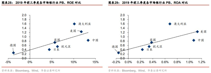 中国银行业ROE高于美国但PB低于美国,部分原因是杠杆较高。理论上而言,ROE与PB呈正相关关系,有PB=(ROE-g)/(r-g)。但在与其他发达国家的对比中,中国银行业的PB估值并未反映出其高ROE的特点。我们认为原因之一为杠杆倍数较高,因此风险溢价较高推升了必要收益率。若剔除杠杆因素,仅关注ROA,则2019年前三季度中国银行业ROA略低于美国银行业ROA。