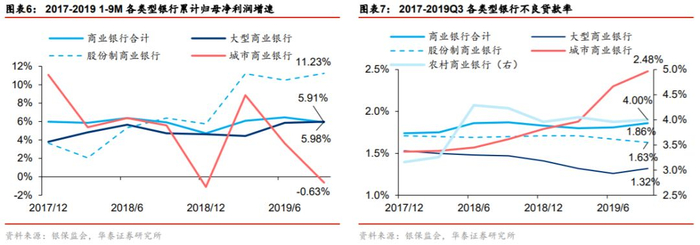 伴随风险出清的推进,2020 年银行业的集中度有望提升。2019 年是银行业分化加剧的一年。年中包商银行因为严重信用风险被监管机构接管,随后锦州银行引进工银金融资产等三大战略投资者入股、中央汇金公司入股恒丰银行等事件标志了银行业风险处置加速。在风险处置节奏加快的背景下,中小银行经营数据表现较弱:资产增速放缓、不良贷款率上升,其中城商行前三季度利润增速转为负数。