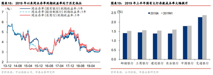 同业负债继续下行空间小,存款成为新的降成本工具,在降成本的配合下,息差下行压力较为有限。目前存款准备金率仍有下降空间,若经济存在下行压力,降准仍有可能,可减轻银行负债成本压力。我们认为存款有望接力同业负债,成为降成本的主要推动力。一方面,同业负债成本降低的红利期结束,同业存单到期收益率维持于历史低位运行,继续下行的空间较小。另一方面,存款成本存在压降空间。2019 年上半年银行存款成本率上升明显。以国有大行为例,其存款成本率较 2018 年全年平均提升12bp。10 月银保监会发布《关于进一步规范商业银行结构性存款业务的通知》,结构性存款得到规范。在负债成本压力缓释的背景下,息差下行空间预计有限。