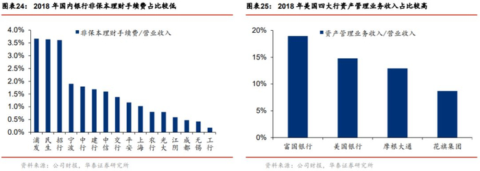 理财业务步入转型最后一年,理财子公司开业有望全面铺开,收入贡献逐渐呈现。理财子公司的设立使银行理财业务实现更专业的运营,扩大客群范围(销售起点降低至1元)和投资范围(可配置权益类资产)、不强制要求面签等利好措施均可加快银行理财业务发展。截至2019年11月,已有7家银行理财子公司获准开业。而与美国大行相比,国内银行理财手续费贡献的中间收入占比较低,随着理财子公司的开业运营,理财业务对中收的贡献有望提升。