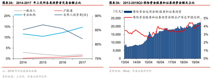 培育长期机构投资者,是资本市场成熟的重要标志。A股正在经历去个人化的过程,2015年以来专业机构投资者交易额占比逐年提升,2017年底已达15%左右,而个人投资者占比下滑明显,培育长期机构投资者是 A 股市场的大趋势。未来市场上的重要的机构投资者包括保险公司、养老金、银行理财子公司等。以保险资金为例,目前银保监会正在积极研究部分保险机构提出的“保险资金权益投资比例上限由30%增至40%”建议,保险资金投资比例的增加将加快机构主导股票市场的节奏。
