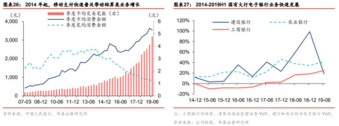 移动支付带动结算类、电子银行业务收入持续高增。2014年起,移动互联网的普及带动了移动支付发展,挤出了部分现金支付,银行结算、电子银行业务快速发展。公共交通、便利店等日常现金支付场景纳入移动支付体系后,银行卡消费呈现小额高频的特点,笔均消费金额减小、卡均消费笔数和消费金额快速上升。电子银行收入为国有大行中间收入增长奠定了坚实基础。移动支付正逐渐下沉至县域地区,覆盖面有望进一步扩大,为银行结算、电子银行业务继续赋予动能,相关收入有望维持高增长。