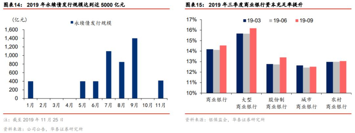 从投放能力来看,监管层鼓励补资本的动作不断增加,资本实力为资产投放赋能。2019年以来监管层通过推广创新资本工具为银行补充资本的成效显著。1月中国银行成功发行首单银行永续债,截至2019年11月25日,银行永续债发行规模近5000亿元。除永续债外,更多资本工具的创新也得到了政策明确支持,金融委提出要构建商业银行资本补充长效机制。补资本尤其聚焦于中小银行,近两次金融委会议和三季度货币政策执行报告,均强调了重点支持中小银行补资本。目前银行业资本外源补充强劲,资本充足率提升较快,2019年9月末商业银行资本充足率14.54%,季度环比提升42bp。资本补充为2020年的资产投放奠定了基础。
