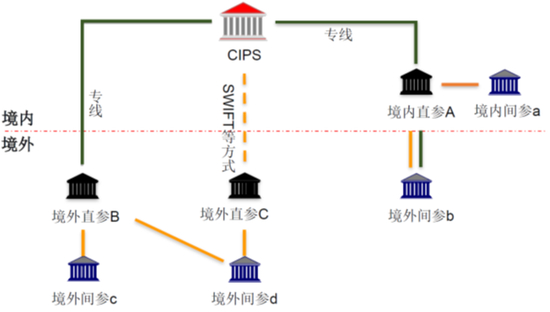 DC/EP对人民币国际化的影响主要体现为基于数字货币的跨境支付。2015年前,人民币跨境结算主要有代理行和清算行两种模式。2015年,人民币跨境支付系统(CIPS,Cross-border Interbank Payment System)上线,作为人民币国际化的“高速公路”,为人民币跨境和离岸业务提供跨时区的资金清算结算业务(图8,引自人民银行支付结算司研究规划处2018年7月《人民币跨境支付系统(CIPS)主要功能及业务管理》)。