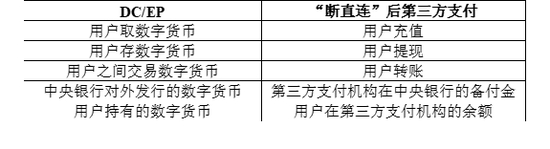 DC/EP与“断直连”后第三方支付之间的差异也非常明显。第一,“断直连”后第三方支付基于第三方支付机构账户以及第三方支付机构在中央银行的备付金账户,是账户紧耦合模式。数字货币基于中央银行管理的数字货币发行登记系统,是账户松耦合模式。