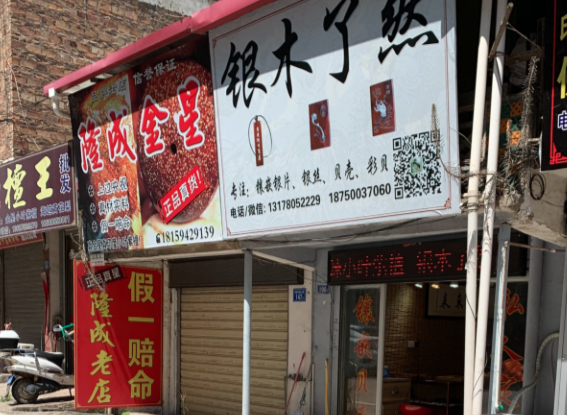 为了赢得消费者的信任,1℃记者在赤荷社区采访时看到,一些商家甚至在店铺门口竖起了“上过央视,真材实料,假一赔命”的巨幅广告。