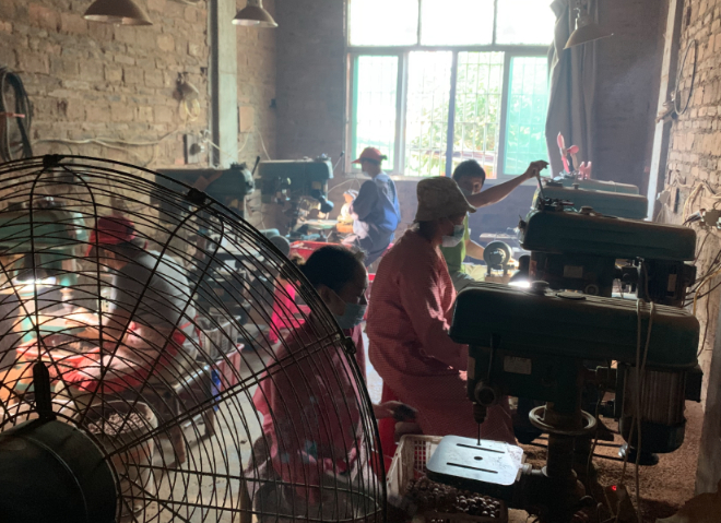 随着这些人的加入,整个榜头镇的小作坊遍地开花。1℃记者在这里看到,随处都有小作坊,它们主要设置在村民家里。几个人,几台设备,便可组成一家手作坊。