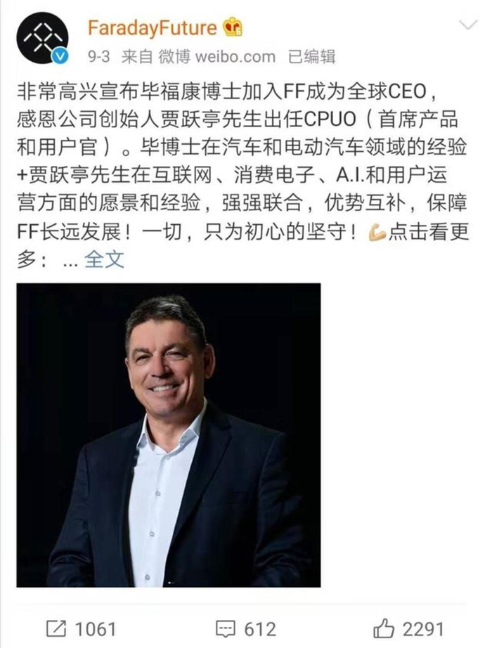 2019.9.3 贾跃亭辞任FF CEO,毕福康接棒,FF在全球招募董事长。