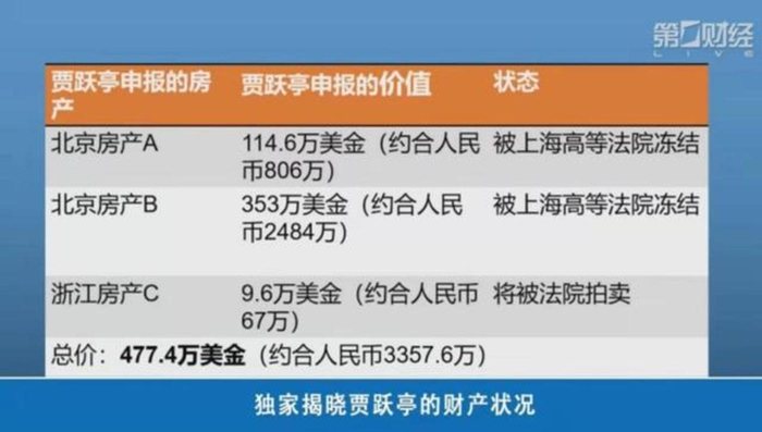 贾跃亭向美国法院申报的个人资产总额达到14.1亿美元,绝大部分是金融资产,还有不动产以及一些私人物品。贾跃亭在国内拥有三处房产,两处在北京,一处在浙江慈溪。三栋房产总价值超过了3357万,目前位于北京的两处房产被上海高等法院冻结,位于浙江的房产将被法院拍卖。