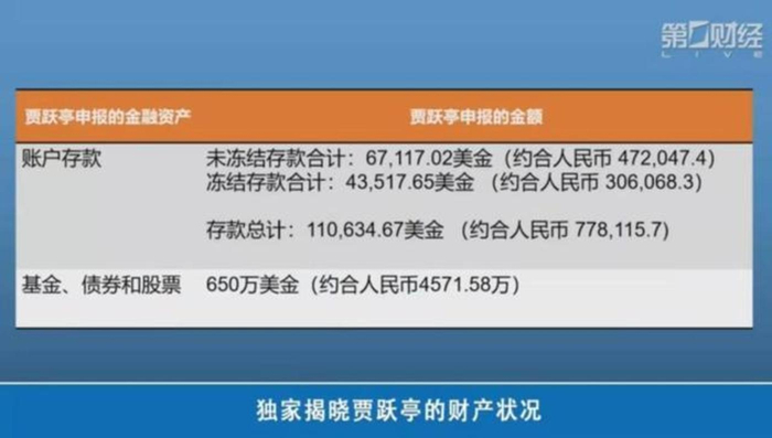 据第一财经统计,贾跃亭未冻结存款仅为6.7万美金,国内冻结的存款大概是30万人民币。总额是77.8万人民币。此外,贾跃亭还在美国加利福尼亚州的欧文市购买了价值650万美金的基金、债券和股票。
