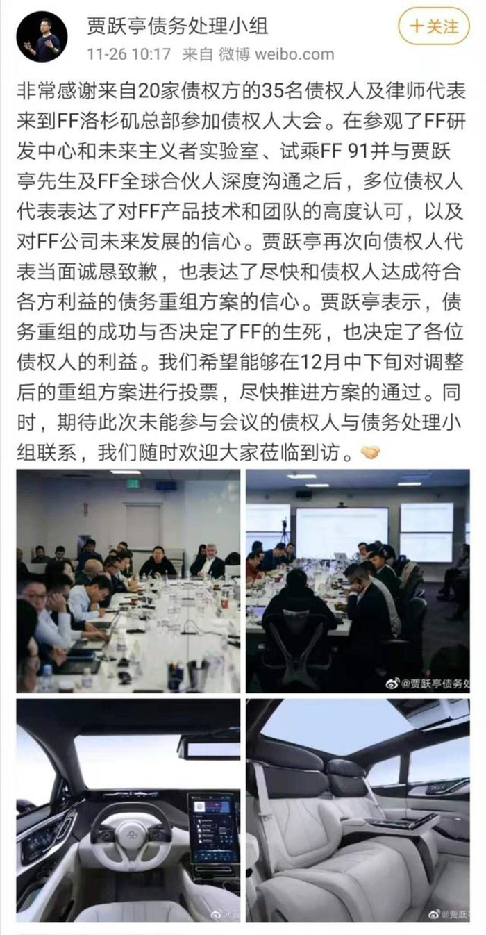 2019.11.11 贾跃亭发布一条致债权人的信,宣布本月25日邀请债权人到访FF总部参加债权人大会。