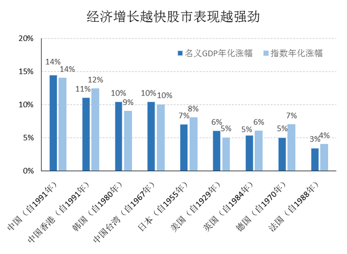 ▼图四:各国名义GDP年化涨幅和指数年化增幅的关系