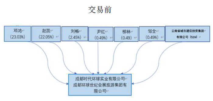 根据此前披露信息,本次城投投资拟挂牌的股权包括环球世纪51%股权以及时代环球51%股权。除去挂牌的该部分股权后,环球世纪、时代环球其余的股权均由邓鸿、赵凯、刘杨、邹全、柳林、尹红等人持有,且二者持股比例相同。