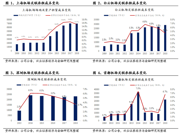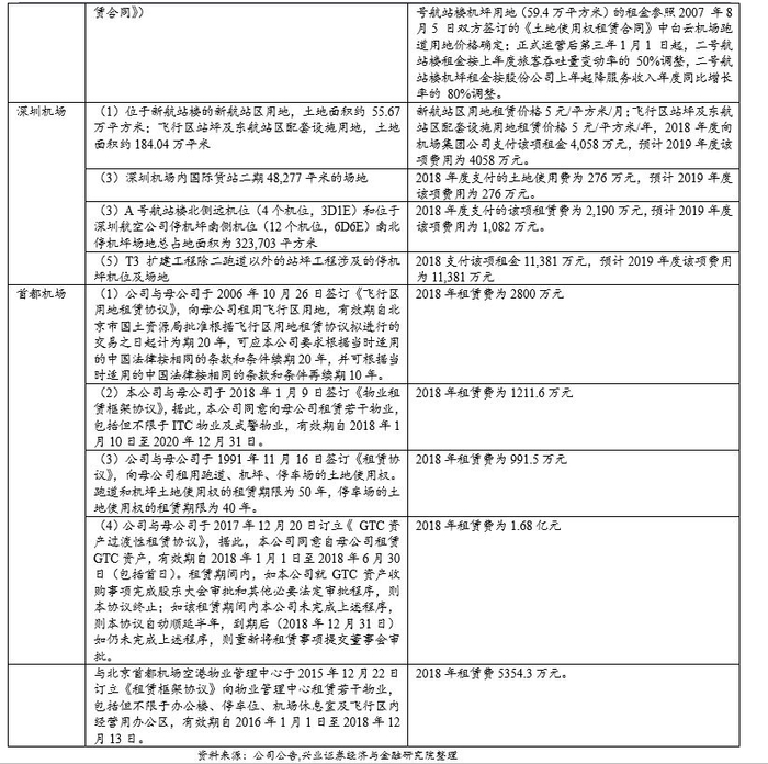 上市公司向集团支付租金租赁资产是另一种常见的做法,这种方式的优点在于可以减轻上市公司的短期资金压力,同时也可规避部分税费支出。但由于机场占地面积大、股份公司向集团等租赁资产和土地规模大,关联承租费用已经成为了上市公司成本中的重要组成部分,2018年上海机场场地和资产关联租赁费用已经在营业总成本中占比超过15%,白云机场、深圳机场和首都机场关联承租费用占比大致在5%左右。