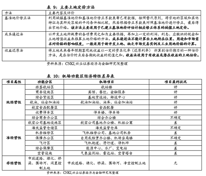 受土地来源和定价方法等因素影响,关联租金定价差异较大。一般来说,土地价格评估常用的方法包括基准地价修正法、成本逼近法、收益还原法等,其中成本逼近法主要土地开发的成本、各项税费及一定利润,适用于新开发土地、缺乏市场交易实例及工业用地价格的计算;基准地价修正法利用城镇基准地价和基准地价修正系数表等已有数据,按照替代原则,计算得出宗地价格,该方法主要适用于已建立基准地价评估计相应修正体系的城镇土地定价,主要适用于已建立基准地价评估计相应修正体系的城镇土地定价。收益法则将土地未来每年预期客观纯收益以一定的资本化率(还原利率) 折算到估价期日的一种估价方法,是在估价时点后各期纯收益的现值之和,适用于有收益或潜在收益的土地估价。在实际运用过程中,考虑到不同机场尤其是不同业务种类之间的经营性质和盈利能力差异较大,实际使用的评估方法不同,导致机场土地租金差异较大
