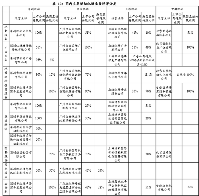 国内机场由于资产分散和民航出于安全、公平竞争等的施加限制,以及业务分割时特定的历史环境,经营业务尤其是非航业务的独立性也受到了一定影响。一般来说,航空主业都有机场股份公司自身运营,但其他业务情况较为复杂:大多数业务都由股份公司、集团或者第三方机构共同组建的合资公司运营,导致一些低毛利业务仍保留在上市公司体内,或者高毛利业务收益流向集团或第三方的情况。