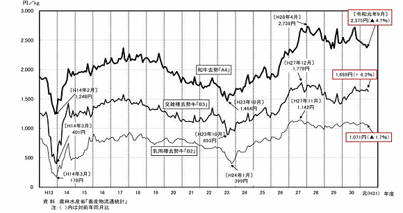 据JA全农肉食株式会社(日本全国农业协同组合联合会100%控股组织,以下简称“JA全农”)的数据,目前在东京市场,A4级别的去势和牛2019年4至10月的平均价格约为2397日元/千克,同比下降23%;11月去势和牛的价格为2442日元/千克,比去年同期都略低。