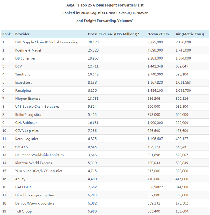 全球货运代理TOP25排行榜,以企业2018年总营业收入、海运货量、空运货量为评价依据,数据来源于公司报告或AA测算,收入已被转换为美元,以便比较。最终排名是结合各自总营业收入、海运货量、空运货量等得出的平均排名。